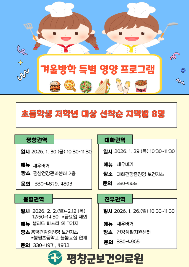 평창군보건의료원은 26일부터 2월 12일까지 평창읍, 대화면, 봉평면, 진부면 등 4개 지역에서 초등학생 대상으로 '겨울방학 특별 영양 프로그램'을 운영한다.