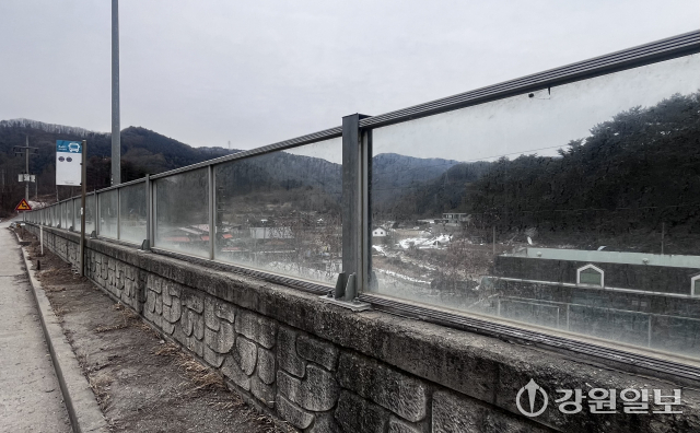 26일 찾은 춘천시 신동면 삼포사거리 인근 1.5km 길이의 투명한 방음벽에는 야생조류의 충돌을 방지하기 위한 저감 필름이 설치되지 않은 모습이었다. 주민 유모(64)씨는 “멧비둘기, 참새 등 새가 많이 부딪친다는 이야기를 들었다”고 전했다. 실제 이 곳에서는 붉은머리오목눈이가 이 방음벽에 부딪쳐 폐사한 내용이 온라인 자연활동 공유 플랫폼 ‘네이처링’에 기록되기도 했다.