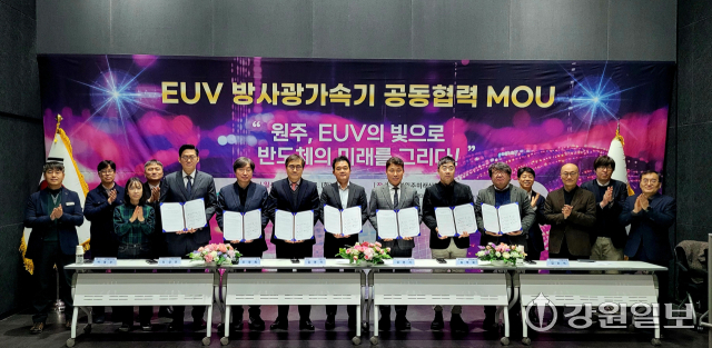 시와 원주미래산업진흥원, (주)이솔, 강릉원주대·상지대·연세대 미래캠퍼스·한라대 산학협력단은 27일 원주미래산업진흥원에서 EUV 방사광가속기 공동협력 협약을 했다. 이날 자리에서는 사업 설명과 협약서 서명 등이 진행됐다.