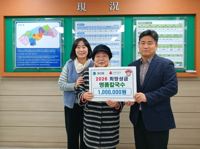 명품칼국수(대표:원화숙)는 지난 26일 원인동행정복지센터를 방문해 취약계층을 위한 2026 희망성금 100만원을 기탁했다.