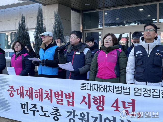 민주노총 강원본부는 27일 고용노동부 강원지청 앞에서 기자회견을 열고 ‘법의 엄정한 집행과 경영자 실질 처벌 강화’를 촉구하고 나섰다.