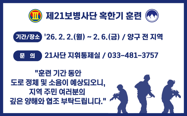 【양구】육군 21사단은 다음달 2일부터 6일까지 닷새 간 양구 전 지역에서 ‘2026년 혹한기 전술 훈련을 실시한다.