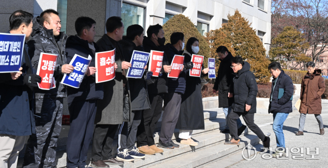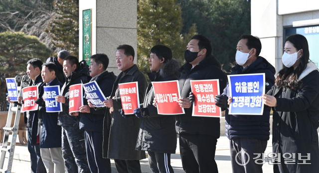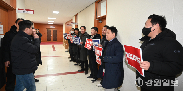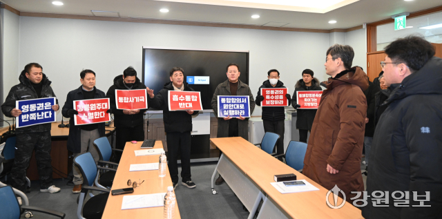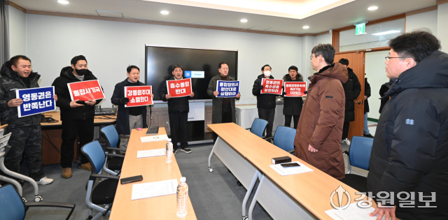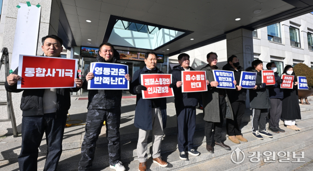 강릉원주대 총동문회는 28일 대학본부를 찾아 "통합이행합의서 원안대로 추진"을 촉구하며 항의의 뜻을 밝혔다. 강릉=권태명기자