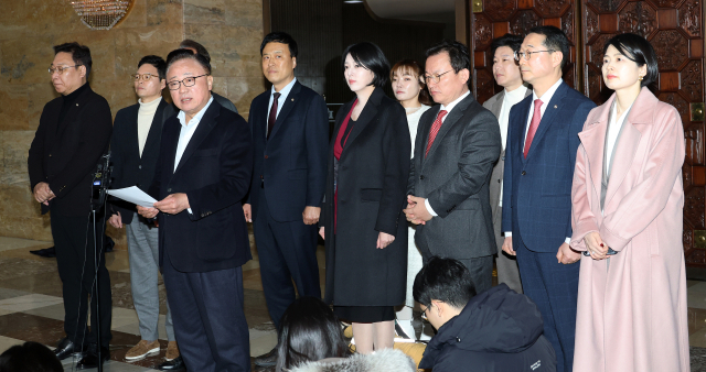 친한계 의원 16명은 이날 국회 예결위 회의장 앞에서 기자회견을 열어 "한 전 대표에 대한 제명 결정은 심각한 해당 행위로, 우리 의원들은 절대 받아들일 수 없다"며 "개인적 이익을 위해 당을 반헌법적·비민주적으로 몰아간 장동혁 지도부는 이번 사태에 책임을 지고 즉각 물러나라"고 촉구했다.