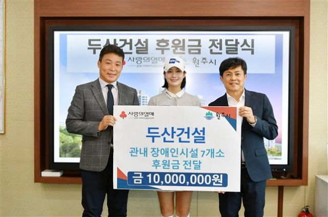 김문기 원주부시장과 오세욱 두산건설 상무, 박결 두산건설We’ve 골프단 프로 골프선수 등이 참석한 가운데 전달된 기부금은 사회복지공동모금회 강원도지회를 통해 지역 내 장애인복지시설 7곳에 전달된다.
