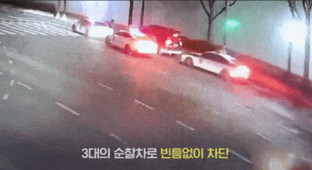 경찰은 순찰차 2대로 동시에 추격하다가 인계사거리에 이르러 A씨의 차량 앞을 가로막아 정차시켰다.