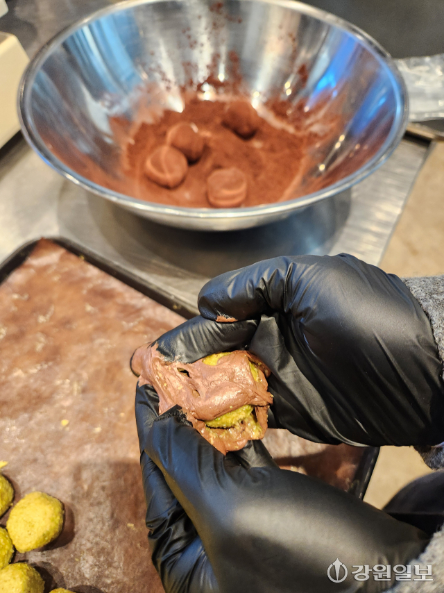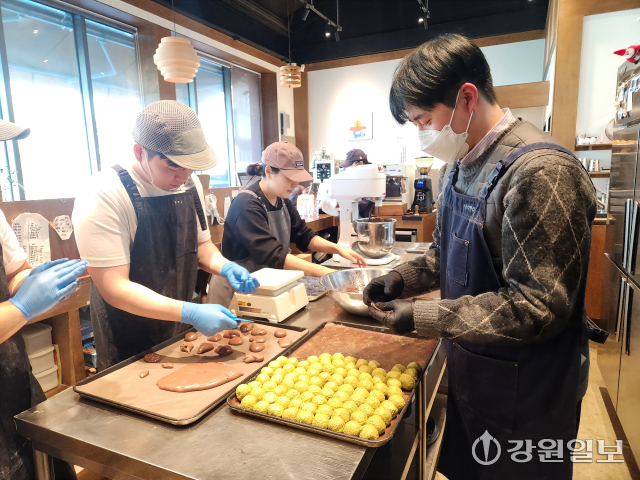 지난 30일 오후 3시, 춘천 신촌리의 한 카페. 점심시간 이후 비교적 한산한 오후 3시부터 6시까지 이곳에서는 매일 두쫀쿠 약 300개를 만든다. 사장을 포함해 직원 5명이 분업해 작업에 나선다.