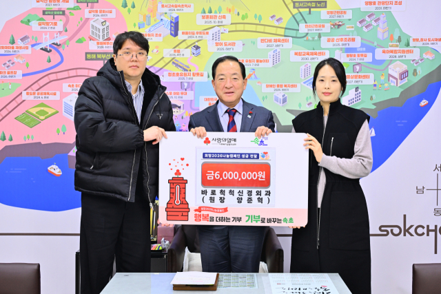 바로척척신경외과의원(원장:양준혁)은 지난달 30일 속초시청을 방문, 지역 내 사회복지기관인 속초종합사회복지관과 속초시노인복지관에 각각 300만원씩, 총 600만원의 성금을 전달했다.