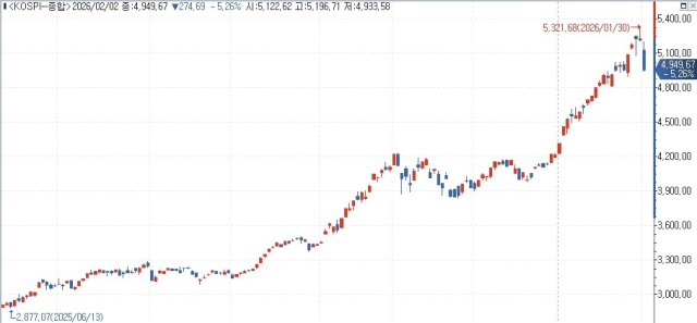 하늘 높은 줄 모르고 치솟던 코스피가 케빈 워시 전 미국 연방준비제도(Fed·연준) 이사의 차기 의장 지명, 은값 폭락 등의 충격으로 5% 넘게 급락하며 5,000선이 무너졌다.