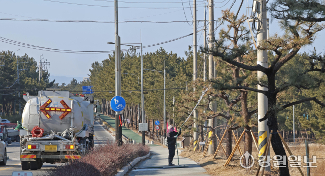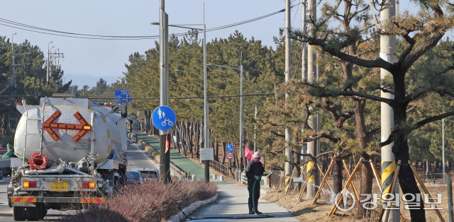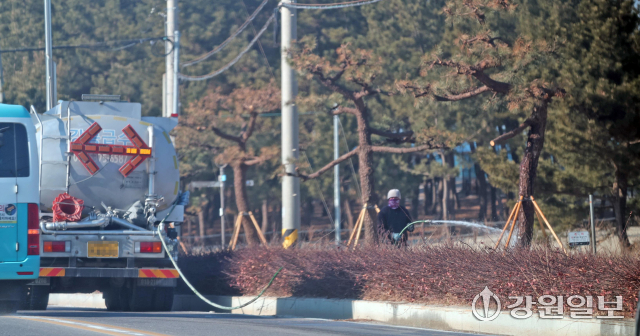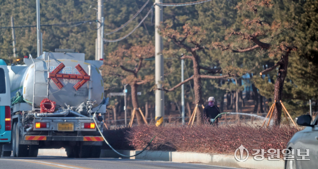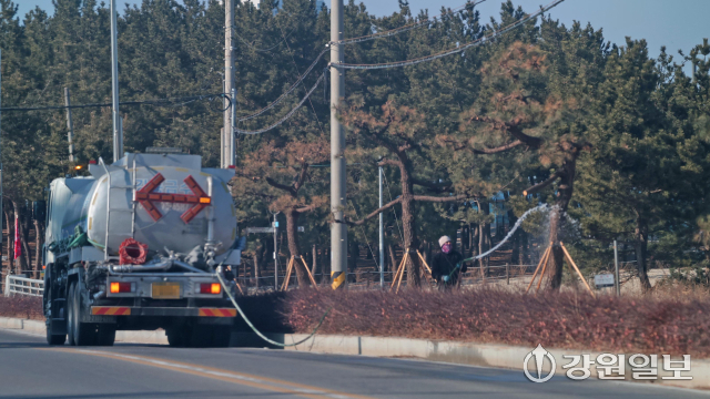 동해안 6개 시·군에 연일 건조경보가 발효 중인 가운데 2일 강릉시 사천면 순포해변 인근 도로에서 살수차가 가로수가 말라죽지 않도록 물을 뿌리고 있다. 강릉=권태명기자