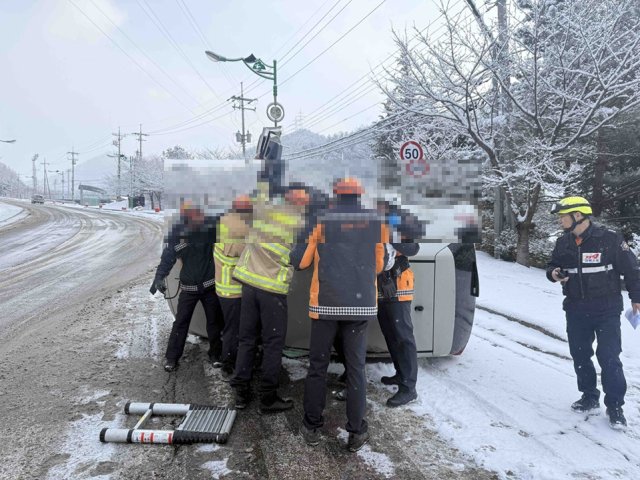 ◇2일 오전 8시50분께 태백시 문곡동 종합경기장 인근 도로에서 모닝 차량이 눈길에 미끄러지며 넘어졌다. 이 사고로 B(55)씨가 부상을 입었다. 사진=강원특별자치도소방본부 제공