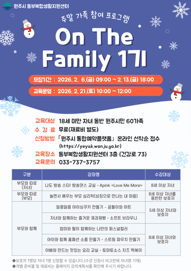이번 과정은 자녀와 함께하는 즐거운 제과제빵, 아빠와 만드는 맛있는 요리교실, 아이와 함께 홈패션 소품 만들기 등 총 7개 강좌로 구성됐다. 대상은 18세 이하 자녀를 동반한 60가족이며, 수강료는 무료다. 신청은 오는 6일부터 13일까지 원주시 통합예약플랫폼(yeyak.wonju.go.kr)에서 선착순으로 모집한다.