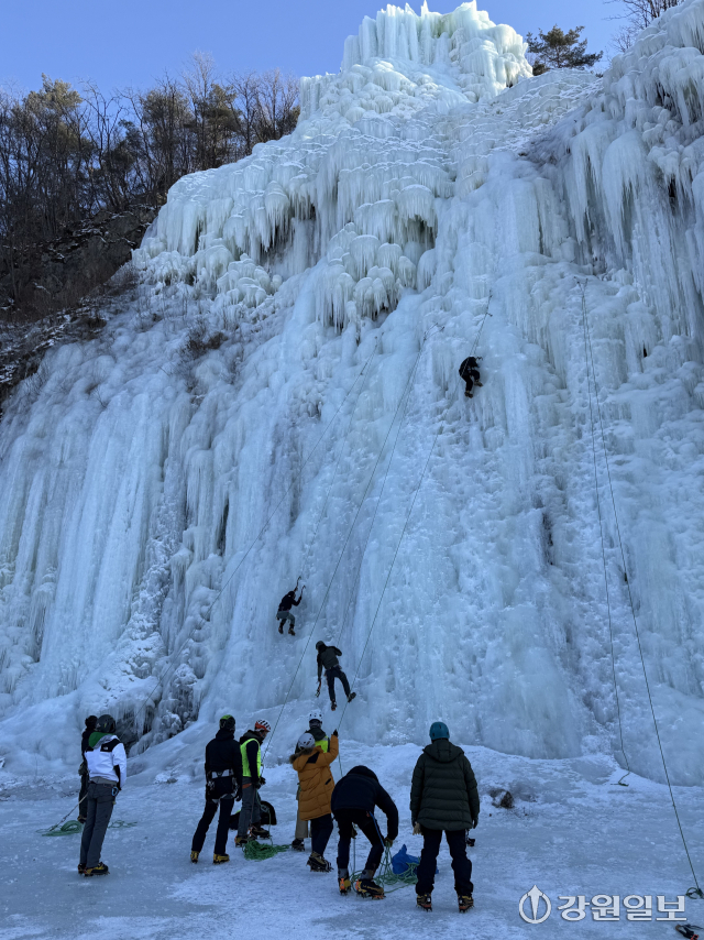 ■전국서 찾는 빙벽장…‘축제’ 없어도 사람은 온다=국토정중앙면에 위치한 용소빙벽장은 길이 120m, 높이 84m 규모의 인공 빙벽으로, 산악인들 사이에서 입소문을 타며 겨울철 대표 체험지로 자리 잡고 있다. 최근에는 서울 건국대 산악회 20여명이 단체 방문한 데 이어, 제주지역 산악인들도 찾는 등 매년 3,000~4,000명이 방문하고 있다. 서울 성북구에서 온 이모(57)씨는 “서울과 가까운 경기 양주 빙벽장 등은 방문객이 워낙 많아 빙질이 떨어지고 안전사고 우려도 있지만, 양구는 비교적 안정적이고 빙질 관리가 잘 돼 있다”고 평가했다.