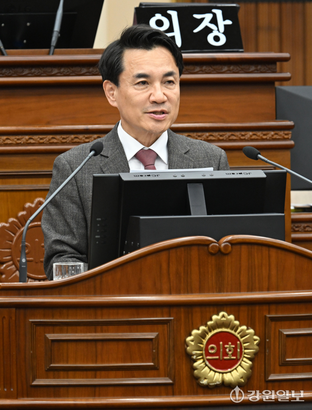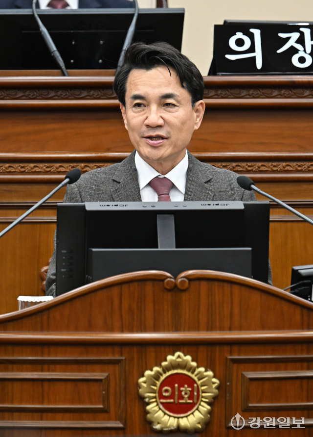 3일 강원특별자치도의회에서 열린 제343회 임시회 1차 본회의에서 김진태 도지사가 신년연설을 하고 있다.