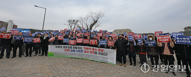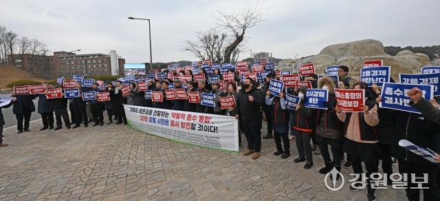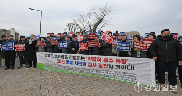 강원대와 강릉원주대의 통합을 통한 강원1도1국립대 출범을 앞둔 가운데 강릉지역 31개 사회단체로 구성된 강릉시민사회단체협의회가 4일 강릉원주대 앞에서 대학 통합이 강릉의 자산을 훔쳐 가려는 교육 침탈이자 강릉 말살 정책이라며 반발하는 기자회견을 하고 있다. 강릉=권태명기자