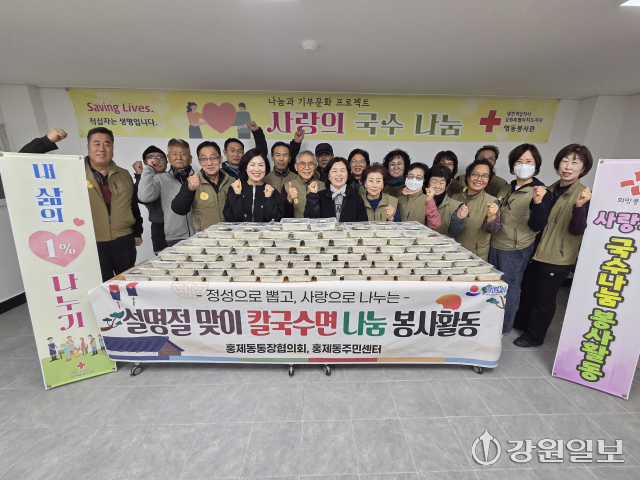 강릉시 홍제동주민센터(동장: 김미영)와 홍제동통장협의회(회장: 신승두)는 4일 설 명절을 맞아 지역 내 취약계층을 위한 칼국수면 나눔 행사를 가졌다. 이번 행사는 윤희주 시의원, 홍제동통장협의회 회원 및 홍제동주민센터 직원 등 약 25명이 참가해 직접 만든 500인분의 칼국수 면을 지역 내 취약계층에게 전달하며 이웃들의 격려와 온정의 손길을 전했다.