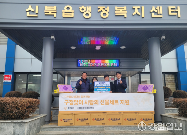 (사)월드쉐어(지부장:김미라)와 춘천운전면허시험장(단장:엄태인)은 4일 신북읍행정복지센터(읍장:김신)를 방문해 지역 취약 계층을 위한 600만원 상당의 오뚜기선물세트를 전달했다.