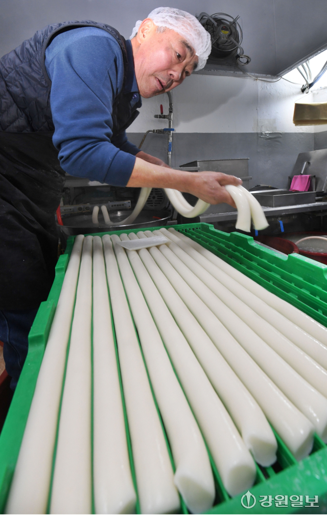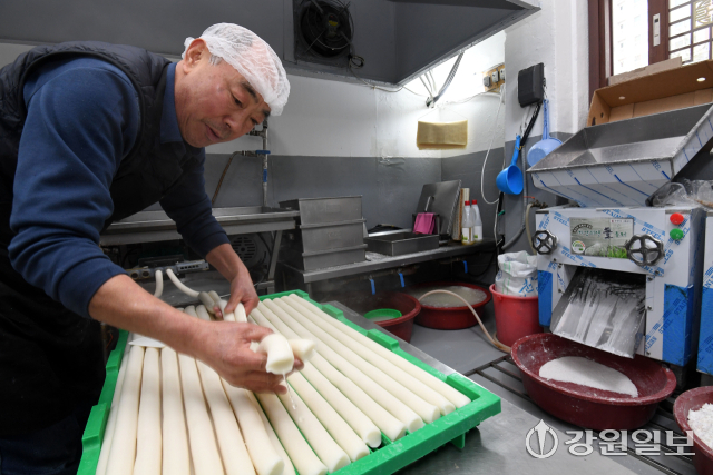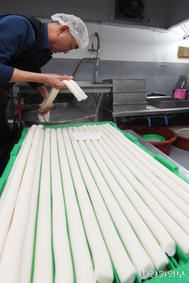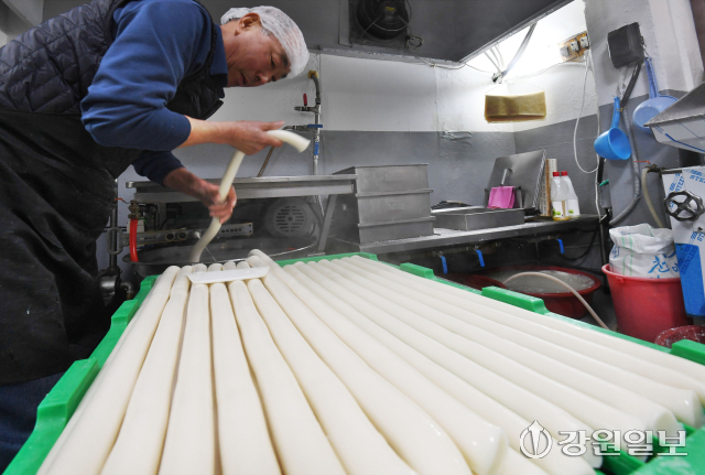설 명절을 앞두고 4일 춘천시 소양로 이삭떡방에서 주인이 하얀 가래떡을 뽑아내느라 분주하다. 최근 쌀값이 크게 오르면서 명절을 준비하는 시민들의 부담이 커지고 있는 가운데 이 곳 방앗간은 지역내 쌀을 소비하는 방식으로 어려움을 이겨내고 있다.