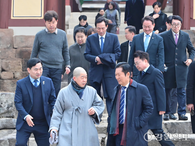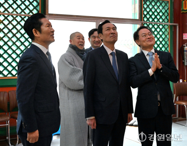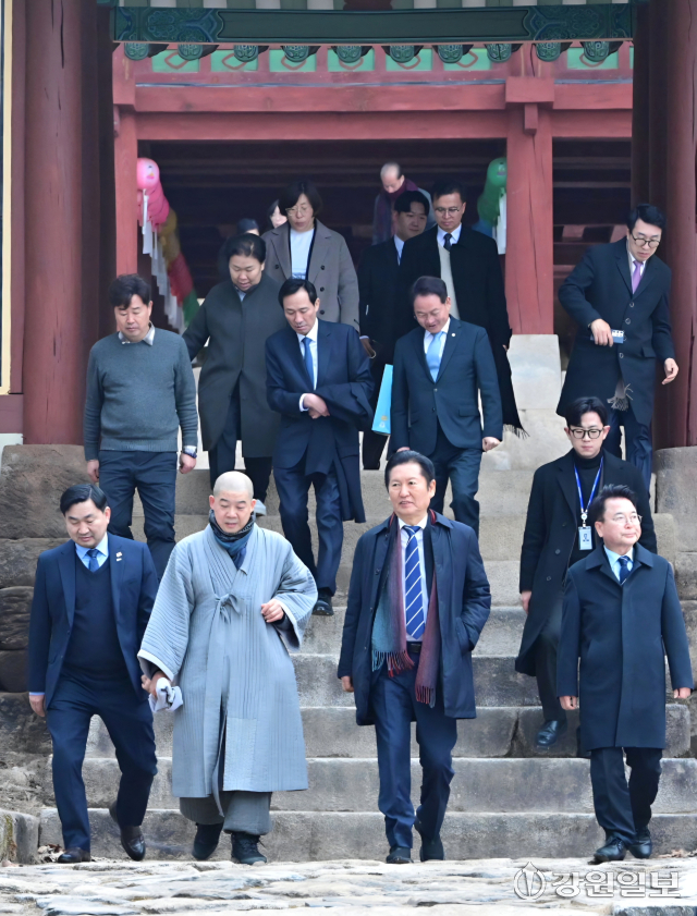 4일 춘천 청평사에서 정청래 더불어민주당 당대표, 문정복 더불어민주당 최고위원, 허영 국회의원, 육동한 춘천시장, 우상호 전 청와대 정무수석, 김도균 도당위원장이 회동하고 있다.