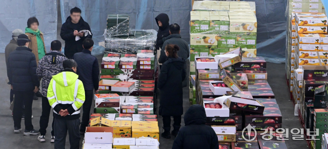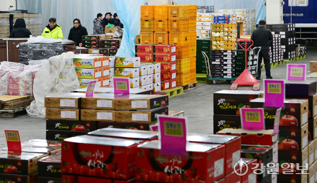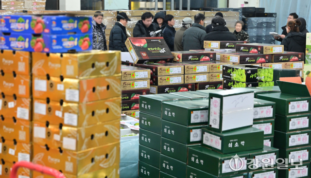 민족 대명절인 설날을 앞둔 가운데 춘천 농수산물도매시장에서 이른 새벽부터 경매인과 상인들이 과일 경매를 하느라 분주하다.