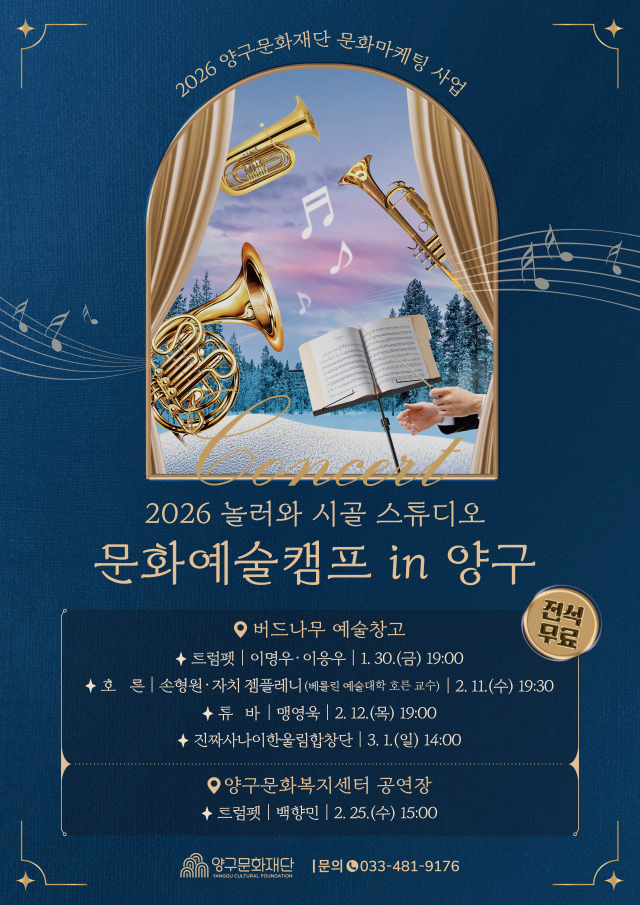 공연 일정은 오는 12일 오후 7시 버드나무 예술창고에서 ‘맹영욱(튜바) 팀 콘서트’, 오는 25일 오후 3시에는 양구문화복지센터에서 ‘백향민(트럼펫) 팀 콘서트’, 다음달 1일 오후 2시에 버드나무 예술창고에서 ‘진짜 사나이 한울림 합창단 공연’이다.