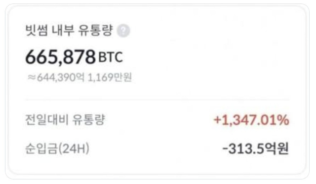 당시 빗썸 모바일 애플리케이션에 표시되는 비트코인 내부 유통량은 평소 약 4만6천개 수준에서 순식간에 66만개를 훌쩍 넘어섰다.