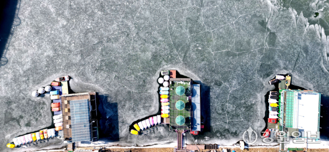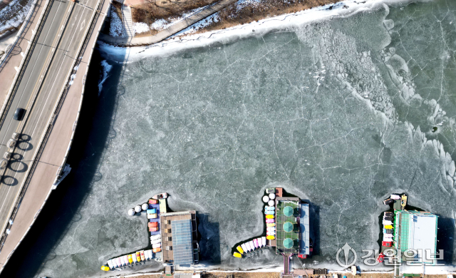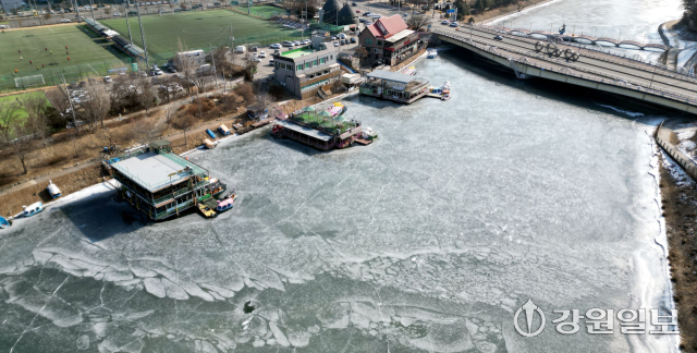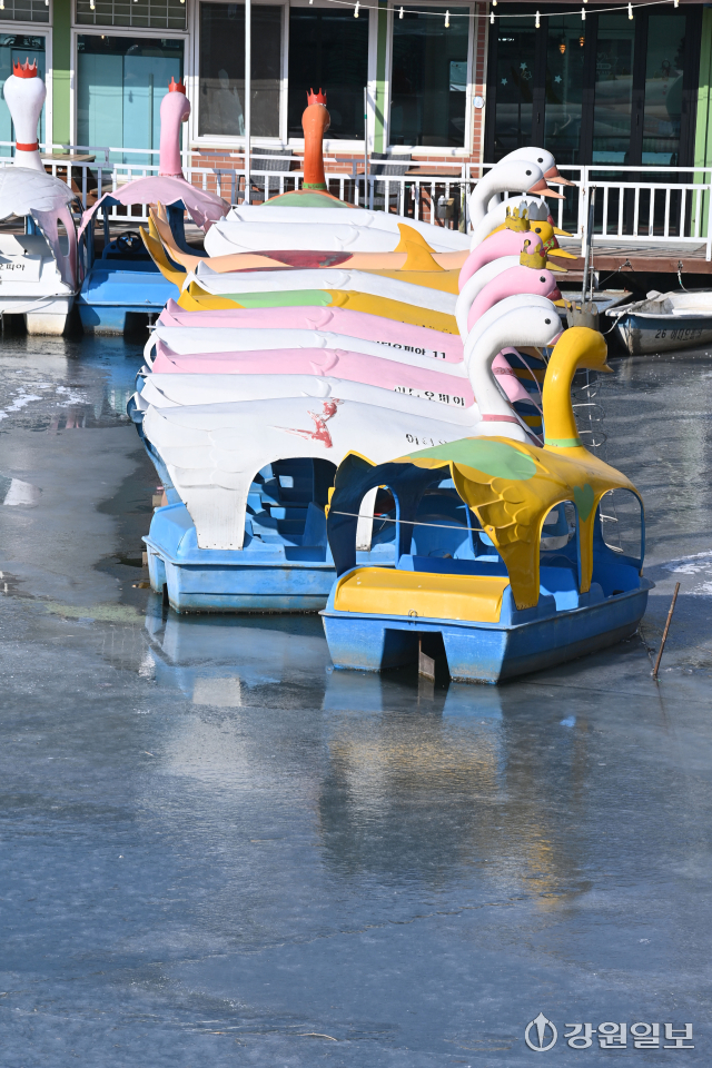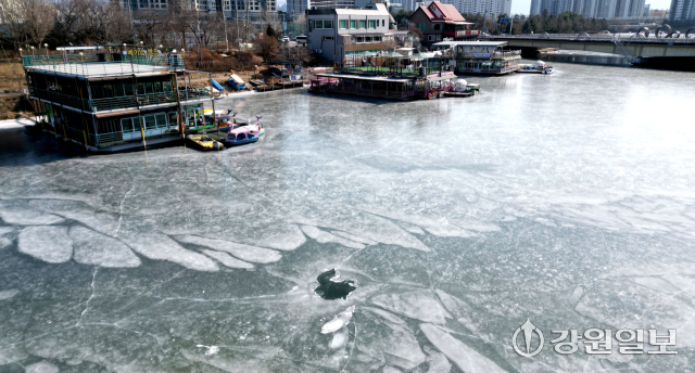 최저기온이 영하 16도 안팎까지 떨어지는 강추위를 보인 8일 춘천 도심 하천인 공지천이 얼어붙어 오리배 보트장이 얼음에 갇혀 있다. 임도혁기자