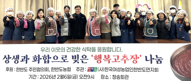 (사)한국여성농업인 한반도면지회(회장:임선희)는 지난 6일 한반도면 청송회관에서 지역 이웃들에게 전달할 ‘행복고추장 나눔행사’를 진행했다.