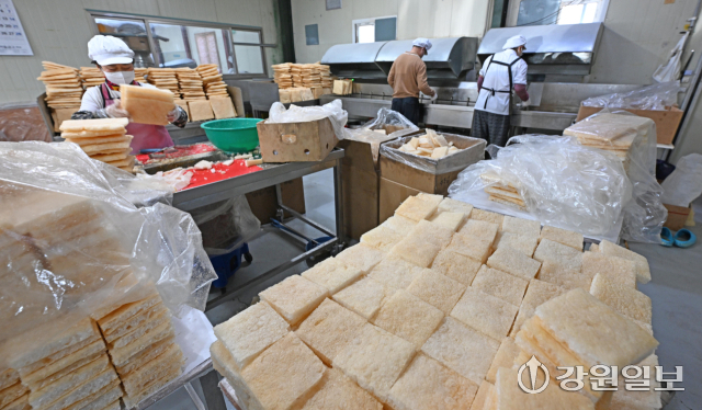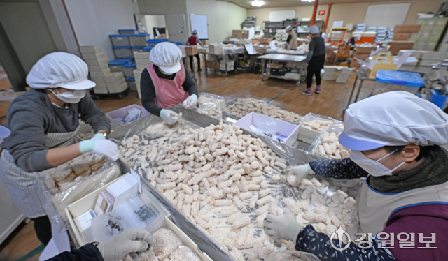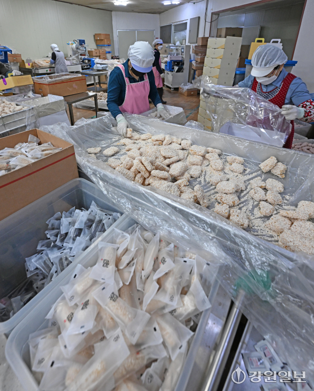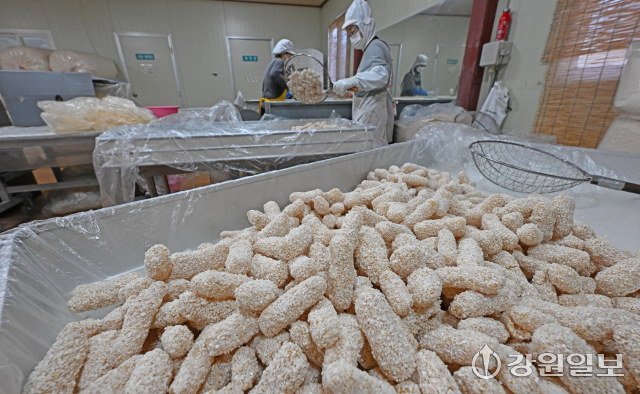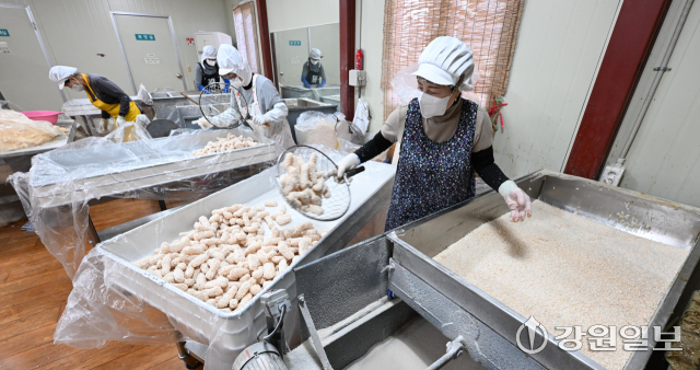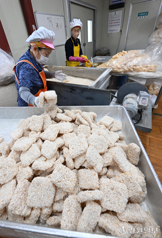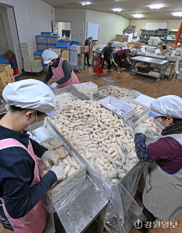 설을 앞두고 9일 강릉의 대표적 전통한과마을인 사천면 명일전통한과에서 직원들이 명절에 사용할 전통한과를 만드느라 분주하다. 강릉=권태명기자