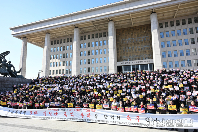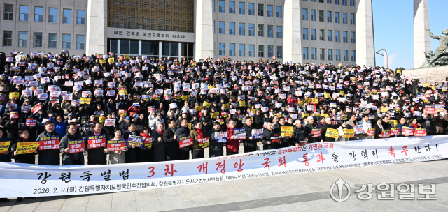 강원특별자치도민 3,000여명이 9일 국회의사당 본관 앞에서 '강원특별법 3차 개정안 통과'를 촉구하며 목소리를 높이고 있다.