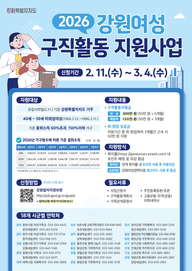 【속초】속초시와 속초여성새로일하기센터가 지역에 거주하는 40세 이상 59세 이하 미취업 여성을 대상으로 ‘2026년 강원여성 구직활동 지원사업’ 참여자를 모집한다. 신청 기간은 11일부터 3월4일까지다.