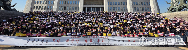 ■강원 외면…불 지피는 野=반면 국민의힘은 삭발과 천막농성 등 벼랑 끝 전술로 맞서고 있다. 선거 초반 각종 여론조사에서 열세를 보이고 있는 만큼 강원특별법 3차 개정을 통한 반전에 사활을 걸고 있다. 보수세가 강했던 강원도를 수성하기 위해 당 지도부와 국회의원들도 총력 지원 중이다. 지난 9일 상경집회에 강원 지역 국회의원들이 총출동했으며 10일 국회 천막농성장에는 장동혁 당 대표, 송언석 원내대표 등이 찾아 광역 통합정책에 대한 우려와 3특 지원 및 강원특별법 3차 개정 필요성 등을 피력하며 정부, 여당을 저격했다.