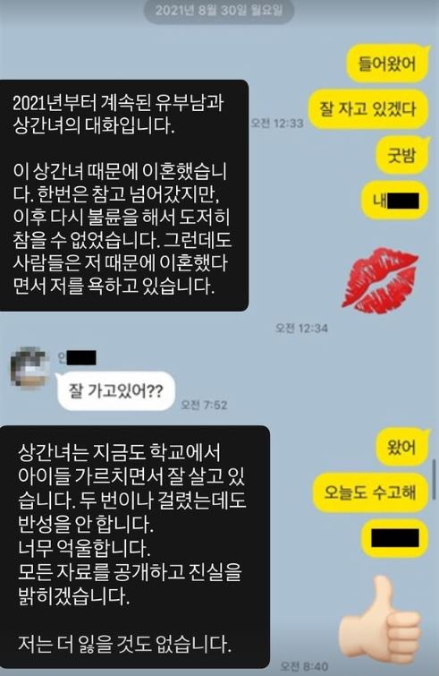 전 남편의 불륜 상대로 지목한 여성에 대해선 "상간녀는 지금도 학교에서 아이들 가르치며 잘 살고 있다. 두 번이나 걸려도 반성 안 한다"며 "너무 억울하다. 모든 자료 공개하고 진실을 밝히겠다. 저는 더 잃을 것도 없다"고 추가 폭로를 예고했다.