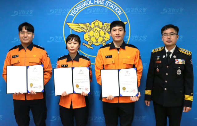 영월소방서(서장:이순균)는 10일 소방서에서 신속하고 전문적인 응급처치로 소중한 생명을 구한 안정기 소방위, 정지웅 소방장, 김준호 소방장, 김민정 소방장, 유영원 소방장, 김정우 소방사, 차준규 소방사 등 7명의 소방대원에게 하트세이버 및 트라우마세이버 증서를 수여했다.