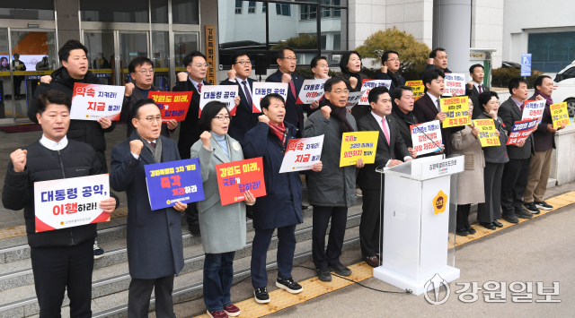 ■도의회 여·야 성명戰=국민의힘 도의원들은 10일 도의회 앞에서 성명을 내고 "국회에서 열린 3차 개정안 통과 촉구 결의대회는 정치적 이벤트가 아니라 강원의 생존과 미래를 위한 도민의 절박한 요구였지만 민주당 소속 국회의원과 도의원은 전원 불참했다"며 불참 사유와 개정안 찬반 입장을 명확히 할 것을 촉구했다. 국민의힘 강원도당 역시 정부의 개정안 즉각 처리와 3특에 대한 5극 수준의 행정·재정적 지원 대책을 요구했다.