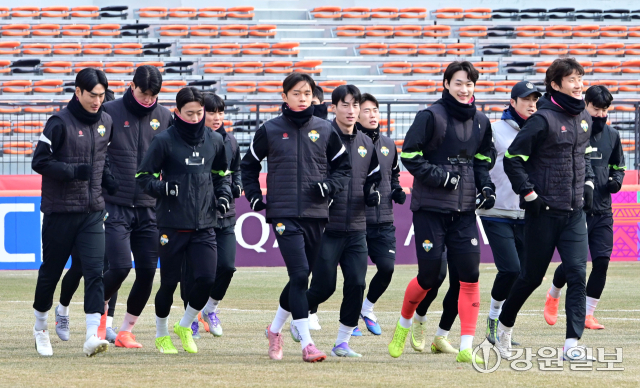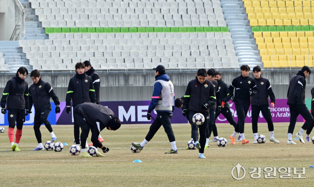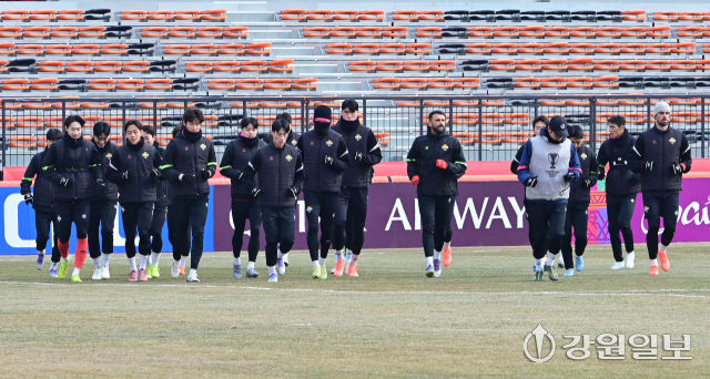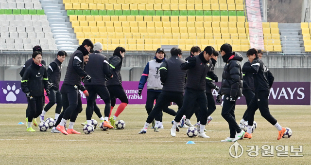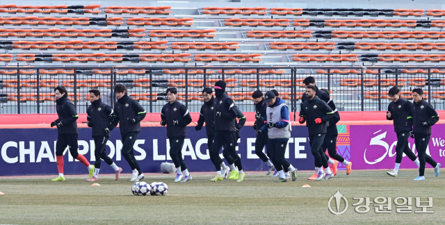 AFC챔피언스리그 엘리트(ACLE) 리그스테이지 7차전 상하이 하이강과의 홈경기를 하루 앞둔 강원FC가 10일 춘천 송암스포츠타운 주경기장에서 미디어 공개 훈련을 하고 있다.