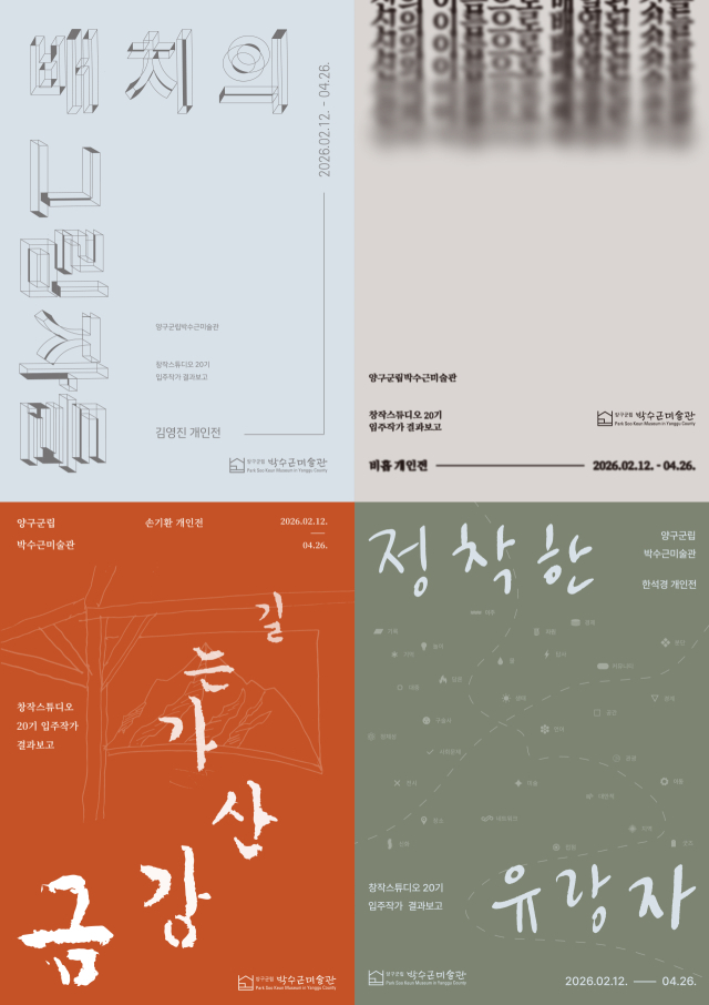 오는 4월26일까지 열리는 이번 전시는 지난해 박수근미술관 창작스튜디오 20기에 입주한 김영진, 비홉, 손기환, 한석경 4인의 작업을 소개하는 자리로, 작가들이 양구에 머무르며 1년간 이어온 각자의 질문과 실천을 개인전 형식으로 선보인다.