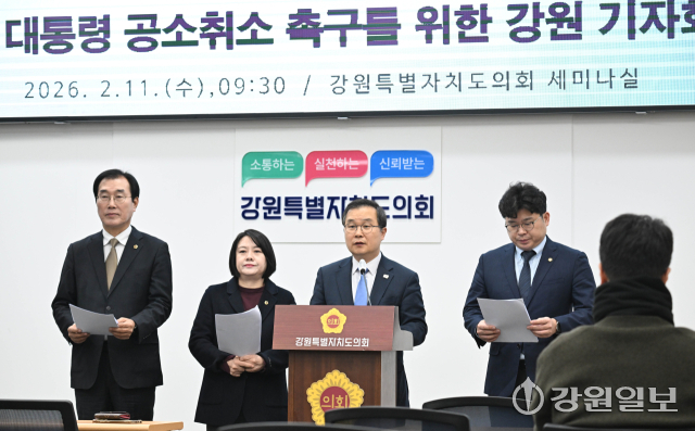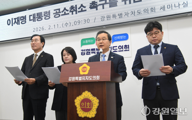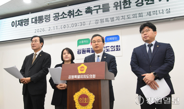 더불어민주당 소속 강원지역 국회의원들은 11일 강원자치도의회 세미나실에서 이건태(경기 부천병) 국회의원과 정재웅·박윤미·전찬성 도의원이 참석한 가운데 '이재명 대통령 공소 취소 촉구'를 위한 기자회견을 갖고 "정치검찰이 조작 기소한 이재명 대통령 사건의 공소를 당장 취소해야 한다"고 촉구했다. 이날 송기헌·허영 국회의원은 회견문에는 이름을 올렸으나 국회 일정상 회견에는 참석하지 못했다.