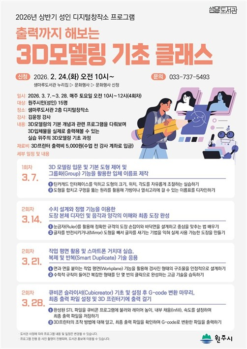 【원주】원주 샘마루도서관은 서부권 시민들의 디지털 창작 역량 증진을 위해 다음달부터 ‘2026 상반기 성인 디지털창작소 프로그램’을 운영한다고 11일 밝혔다.
