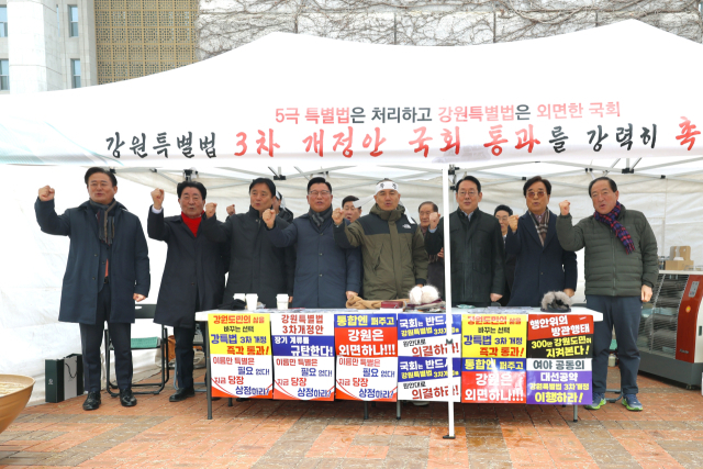 【철원】강원특별자치도시장·군수협의회(회장:이현종 철원군수)가 11일 국회를 찾아 강원특별법 3차 개정을 촉구했다. 이현종 강원특별자치도시장·군수협의회장과 이병선 속초시장, 신영재 홍천군수, 김명기 횡성군수, 최문순 화천군수는 이날 강원특별법 3차 개정을 위해 국회에서 천막농성을 이어가고 있는 김진태 지사를 격려 방문하고 도내 18개 시·군의 뜻을 한 곳으로 모으기로 했다. 이양수·김도읍 국회의원도 김 지사를 찾아 강원특별법 3차 개정에 힘을 보태기로 했다.