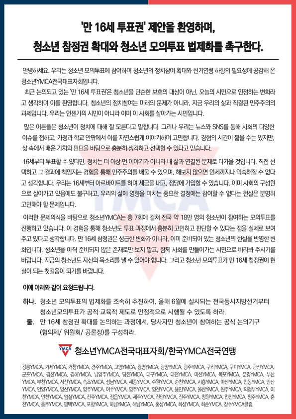 그러면서 “청소년YMCA는 총 7회에 걸쳐 전국 약 18만명의 청소년이 참여하는 모의투표를 진행하고 있다”며 “이 경험을 통해 청소년도 투표 과정에서 충분히 고민하고 판단할 수 있다는 점을 실제로 보여주고 있다. 만 16세 참정권은 성급한 변화가 아니라, 이미 준비되어 있는 청소년의 현실을 반영한 변화다”라고 강조했다.