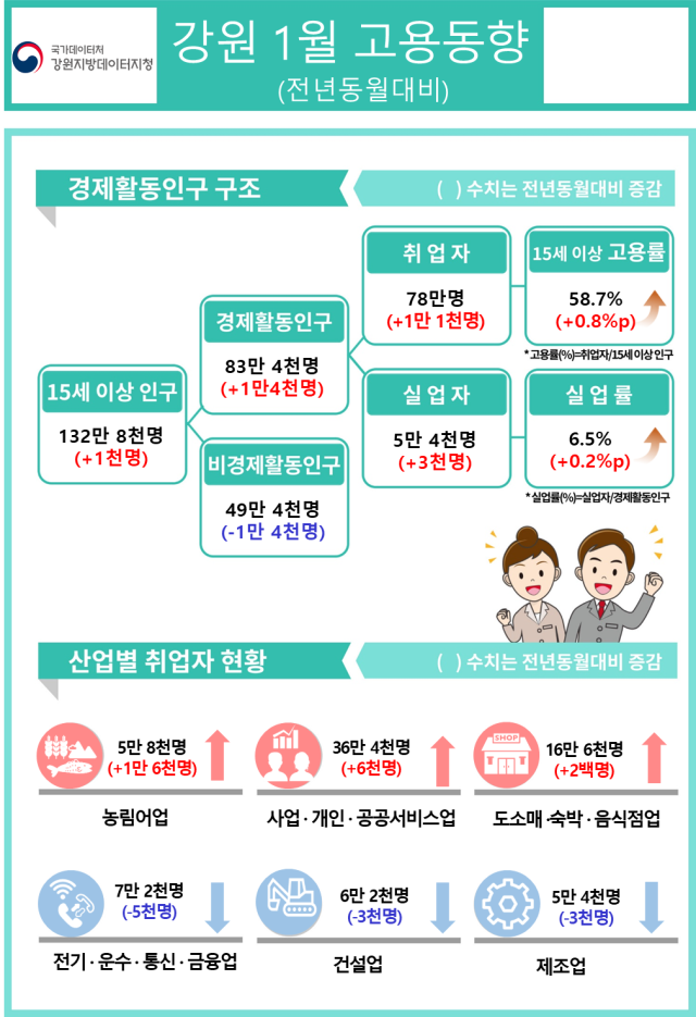 강원지방데이터지청이 11일 발표한 ‘2026년 1월 강원특별자치도 고용동향’에 따르면 지난달 도내 실업자 수는 전년대비 3,000명(5.7%) 늘어난 5만4,000명으로 집계됐다. 지난해 11월 1만8,000명까지 줄었던 실업자는 경기 불황 장기화로 다시 큰 폭으로 증가했다.