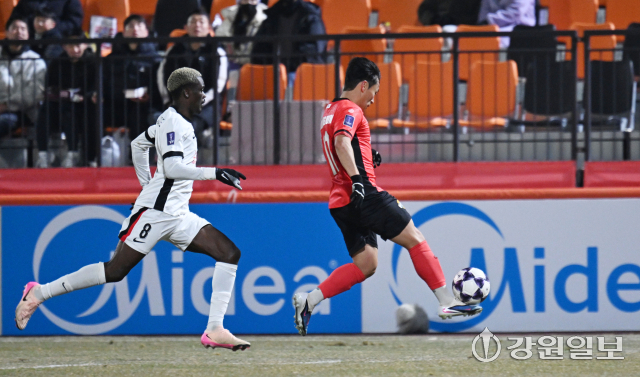 11일 춘천 송암스포츠타운 주경기장에서 열린 AFC챔피언스리그 엘리트 리그스테이지 7라운드 강원FC와 상하이 하이강의 경기에서 강원FC의 고영준이 공을 터치하고 있다. 박승선기자