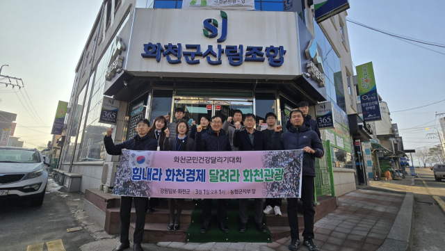 화천군 산림조합(조합장:신준현)은 12일 화천읍에 위치한 조합 사무실 앞에서 오는 3월1일 열리는 제107주년 3·1절 기념 제27회 화천군민건강달리기대회 참가해 화천경제 활성화에 앞장설 것을 다짐하며 파이팅을 외쳤다.