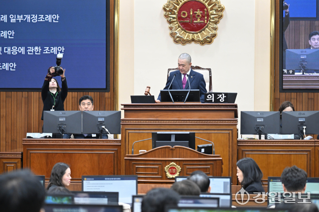 강원자치도의회는 12일 본회의장에서 김시성 도의장을 비롯한 의원들과 김진태 도지사, 신경호 교육감 등이 참석한 가운데 제343회 임시회 제2차본회의를 열고 각 위원회에서 심사·제안된 안건들을 심의·의결하는 등 10일간의 의사일정을 마치고 폐회했다. 박승선기자강원자치도의회는 12일 본회의장에서 김시성 도의장을 비롯한 의원들과 김진태 도지사, 신경호 교육감 등이 참석한 가운데 제343회 임시회 제2차본회의를 열고 각 위원회에서 심사·제안된 안건들을 심의·의결하는 등 10일간의 의사일정을 마치고 폐회했다. 박승선기자강원자치도의회는 12일 본회의장에서 김시성 도의장을 비롯한 의원들과 김진태 도지사, 신경호 교육감 등이 참석한 가운데 제343회 임시회 제2차본회의를 열고 각 위원회에서 심사·제안된 안건들을 심의·의결하는 등 10일간의 의사일정을 마치고 폐회했다. 박승선기자강원자치도의회는 12일 본회의장에서 김시성 도의장을 비롯한 의원들과 김진태 도지사, 신경호 교육감 등이 참석한 가운데 제343회 임시회 제2차본회의를 열고 각 위원회에서 심사·제안된 안건들을 심의·의결하는 등 10일간의 의사일정을 마치고 폐회했다. 박승선기자