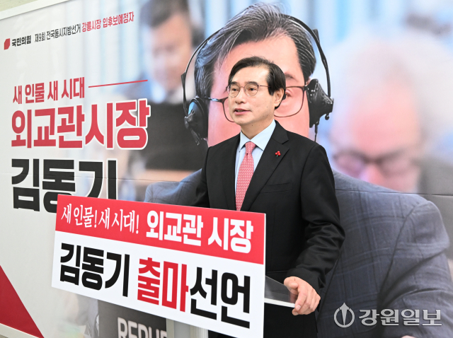김동기 전 유네스코 대사는 12일 강릉대로 선거사무소에서 강릉시장 출마 기자회견을 열어 "37년 외교관의 식견, 오직 내 고향 강릉을 위해 전부 쏟아붓겠다"며 "결과로 증명하는 발로 뛰는 시장이 되겠다"고 밝혔다. 강릉=권태명기자