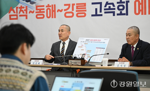 삼척~강릉 고속화 철도 사업이 정부의 예비타당성 조사를 통과한 가운데 김진태 강원특별자치도지사와 김시성 도의장이 12일 도청 브리핑룸에서 기자회견을 열고 있다.