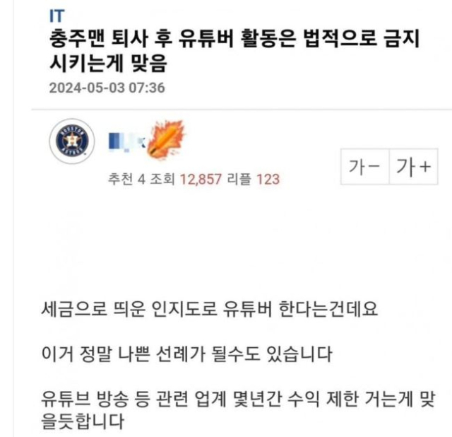 지난 2024년 한 온라인 커뮤니티에는 "충주맨 퇴사 후 유튜버 활동은 법적으로 금지하는 게 맞다. 세금으로 띄운 인지도로 유튜버 한다는 것"이라면서 "정말 나쁜 선례가 될 수 있다. 관련 업계 수익을 몇 년 간 제한하는 게 맞다"고 적었다.