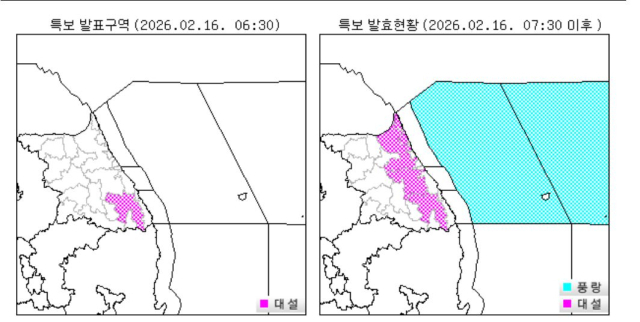 16일 예상 적설량은 강원산지 3~8㎝(많은 곳은 10㎝ 이상), 강원중·남부 동해안 1~5㎝, 예상 강수량은 5~15㎜로 예보됐다.