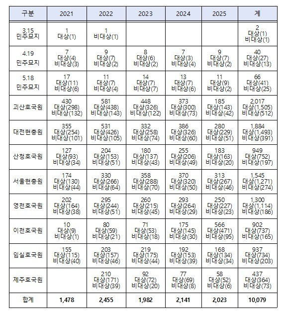 국민의힘 이양수(속초-인제-고성-양양) 국회의원이 18일 국가보훈부에서 제출받은 자료에 따르면 최근 5년간(2021~2025년) 범법자 8,039명이 대전현충원 등 국립묘지 안장 심의를 통과했다. 통과율은 79.8%로, 10명 중 8명이 전과가 있어도 심의에서 통과됐다.
